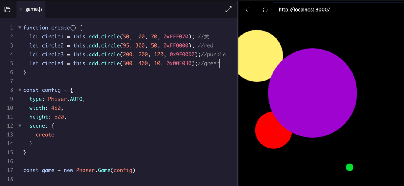 In this exercise, we’re going to cover how to make a simple geometric shape in Phaser. A Circle! To do this, we’re going to use the method this.add.circle(). This creates a GameObject that we can use to represent a circle in the game. GameObjects can have different animations or interactions that we can add to them, but for now, we’re going to focus on drawing them. To make a circle we provide this.add.circle() with four arguments in the following order: