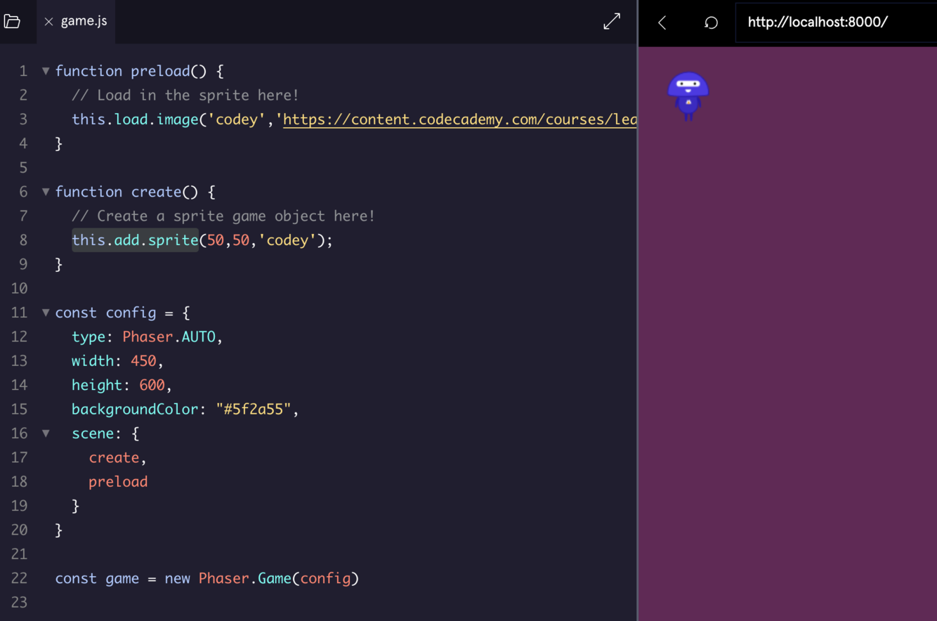 So the two steps to creating a sprite in your game are: Loading the image in preload() with this.load.image() which takes two arguments: a key that you’ll use to refer to it and the path to the image itself. The path can be a local file or the URL for a resource hosted elsewhere on the web.