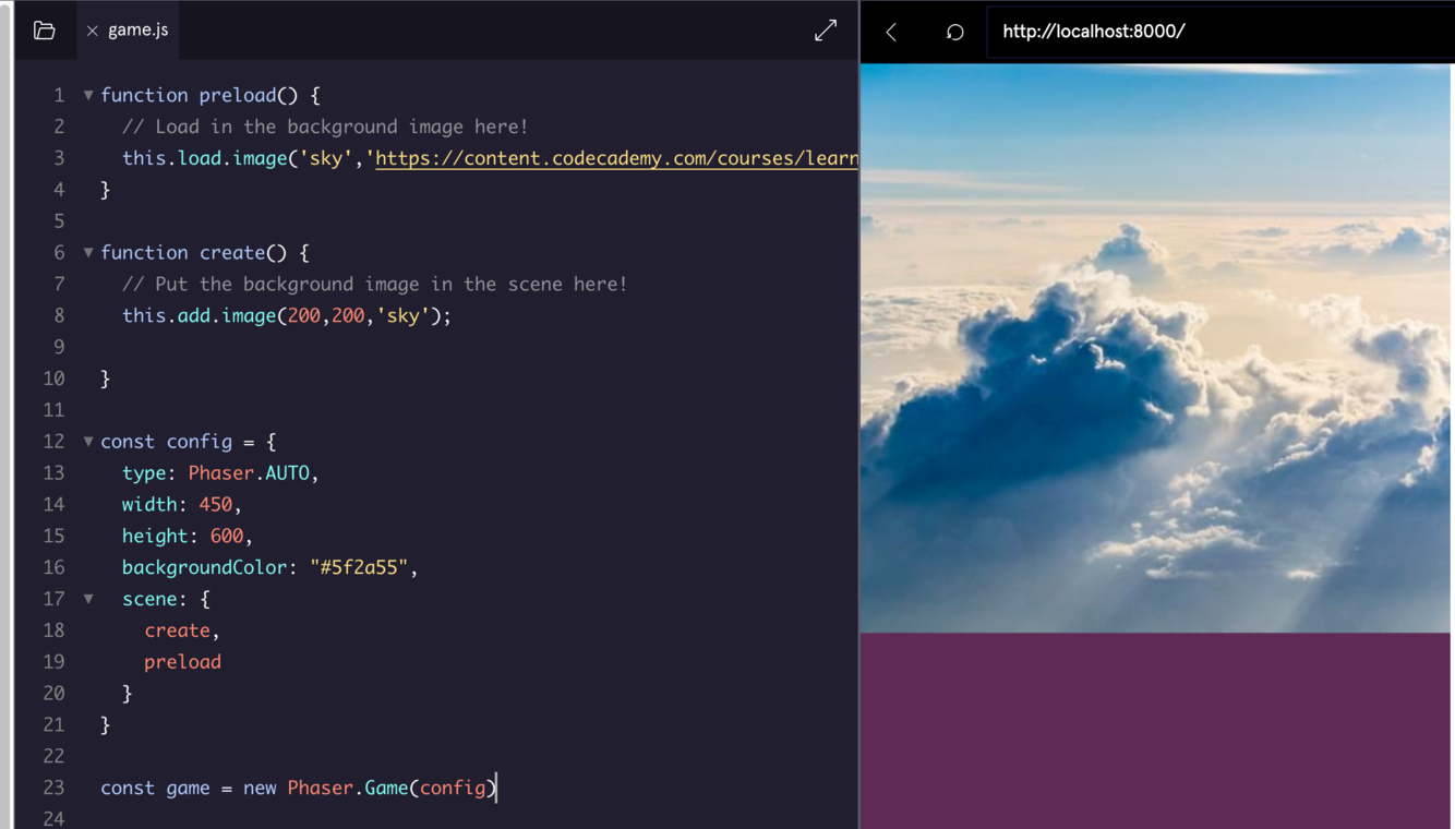 Now that we’ve covered drawing a sprite, let’s talk about drawing a background image. A background image is not a sprite — usually the player will not interact with the background at all. Because of this, we don’t need a sprite object for our background images. We still need to load in the image in our preload() function but we can use this.add.image() instead of this.add.sprite():