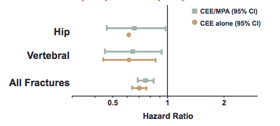 Describe the effects of combo and estrogen HRT on fracture risk.