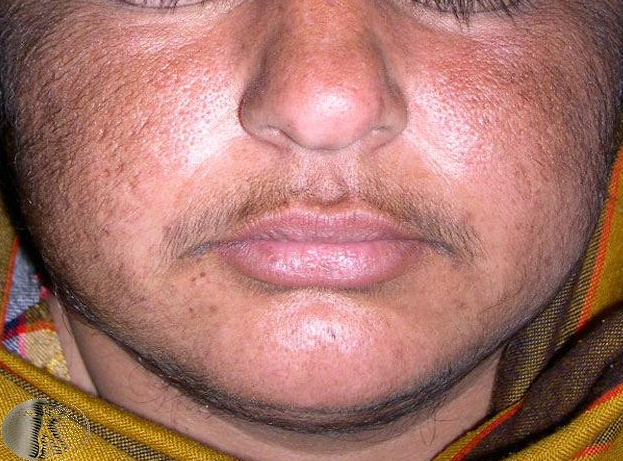 Presents with a bullous eruption on exposure to sunlight (face and hands), the eruption heals with scarring. Fragile, hairy skin.