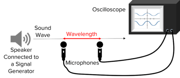 When the waves on the oscilloscope line-up again, stop moving the microphone. The distance between the microphones is the wavelength,