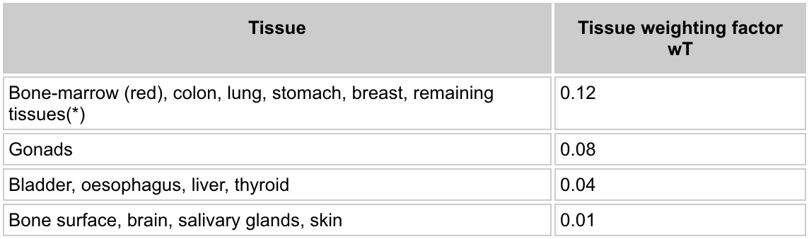 weighting factor WT for each tissue, all of these sum to 1 (ie if you radiate the whole body)