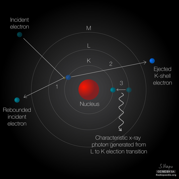 To stabilize the atom an outer shell electron fills the vacancy in the inner shell. The energy which is lost by this electron as it drops to the inner shell is emitted as characteristic radiation (an x-ray photon) or as an Auger electron