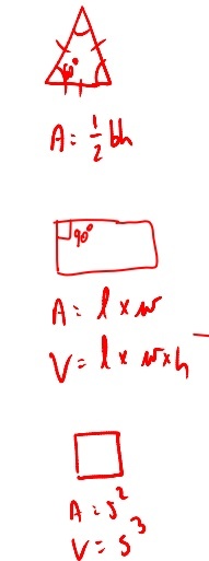 What are the areas and volume formulas for triangles and rectangles and squares?