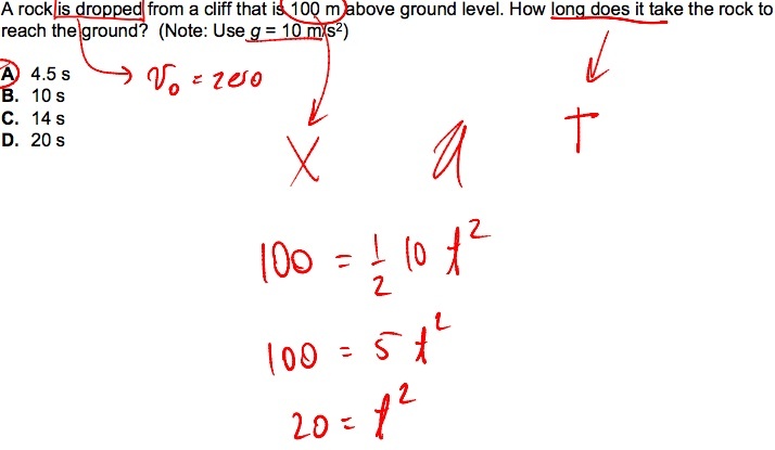 A rock is dropped from a cliff that is 100 m above ground level. How long does it take the rock to reach the ground? (Note: Use g = 10 m/s2)