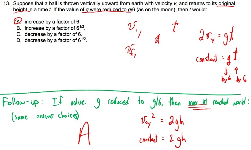 Suppose that a ball is thrown vertically upward from earth with velocity v, and returns to its original height in a time t. If the value of g were reduced to g/6 (as on the moon), then t would: