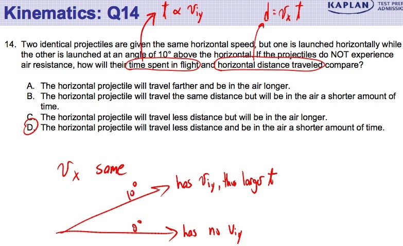 Two identical projectiles are given the same horizontal speed, but one is launched horizontally while the other is launched at an angle of 10° above the horizontal. If the projectiles do NOT experience air resistance, how will their time spent in flight and horizontal distance traveled compare?