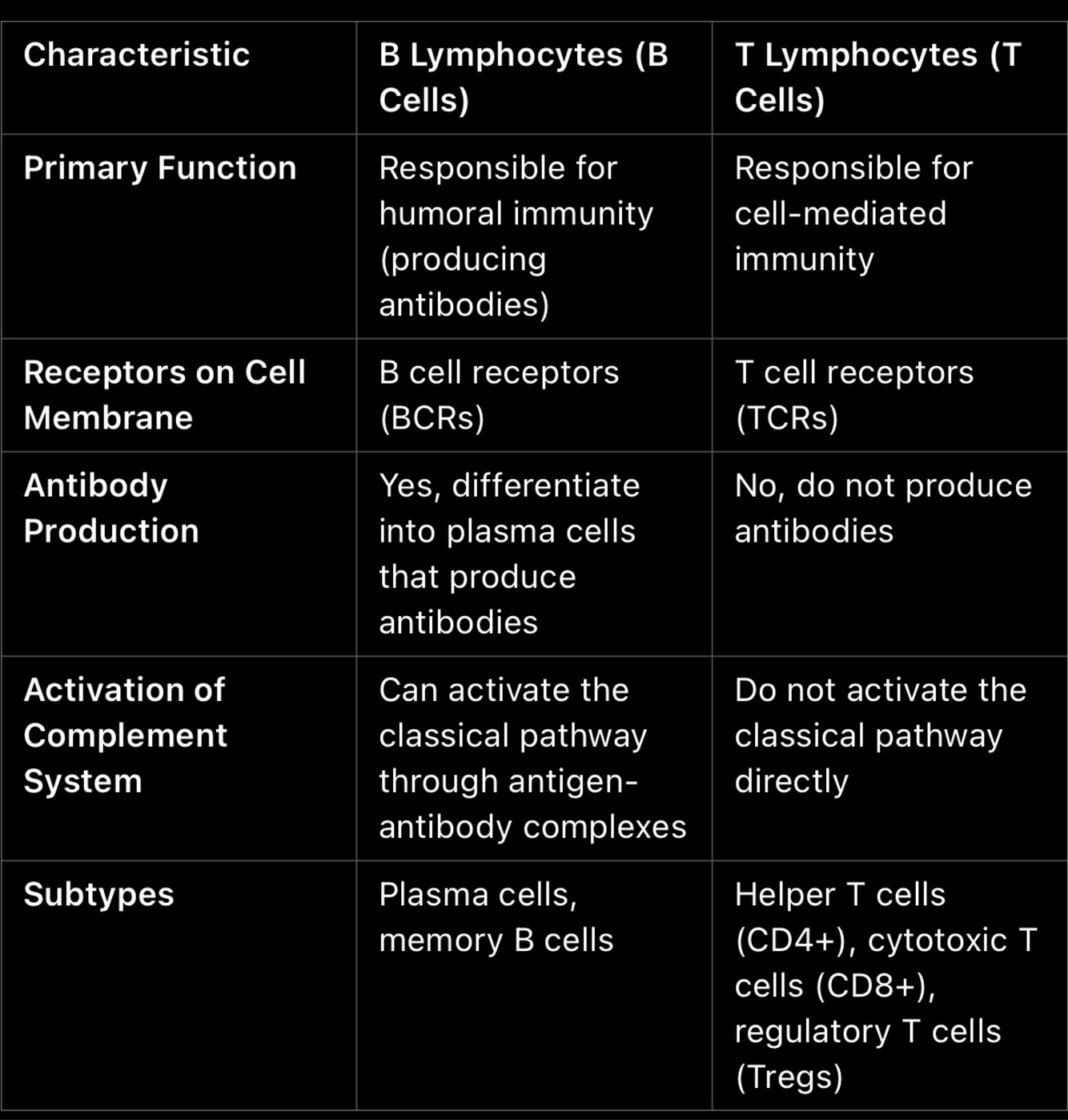Rationale: B lymphocytes are responsible for humoral immunity, which involves the production of antibodies to neutralize pathogens. T lymphocytes, on the other hand, are involved in cell-mediated immunity, directly attacking infected cells or helping other immune cells.