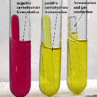 This test is called the Mixed Acid Fermentation (MR) test and is used to detect the presence of multiple stable acid end products from glucose fermentation. Many bacteria, particularly enteric (intestinal) bacteria, produce multiple acids from glucose fermentation such as: lactic, acetic, succinic, formic, etc. If a bacterium produces enough acids to change the medium to a pH <5, they are called mixed acid fermenters. MRVP tubes contain glucose (a fermentable sugar), peptone (a protein source), and dipotassium phosphate (a buffer to resist pH changes and therefore prevent death of the microbes being studied). After incubation for 48 hours, 2 ml of broth is removed and added in a REACTION TUBE. A few drops (3-4) of the indicator methyl red are added to the REACTION TUBE (not the incubation tube). Methyl red is red at pH 4.4 and yellow at pH 6.2. The broth will turn pink-red if positive for mixed acid fermentation; any other color is negative or inconclusive.