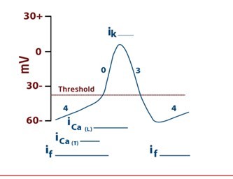 Phase 4: resting membrane potential. membrane is -60 mv opening of slow Na channels that give inward current which causes depolarization