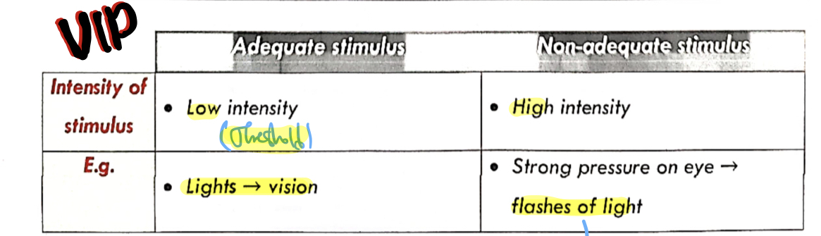 Compare between adequate stimulus & Non-adequaqte stimulus in terms of: