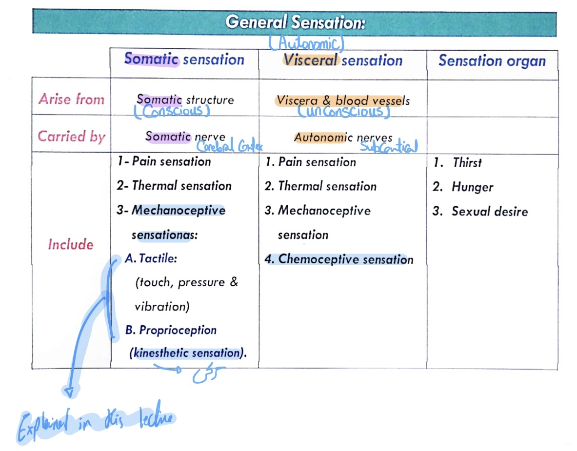 Com pare between Somatic sensation, Visceral sensation & Sensation organ in terms of: