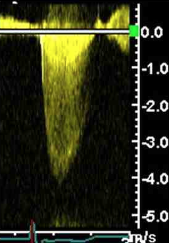 the bright yellow area represents the low velocity/large area of the LVOT, and the peak of 4 m/s represents the large velocity/small area through a stenosed aortic valve.