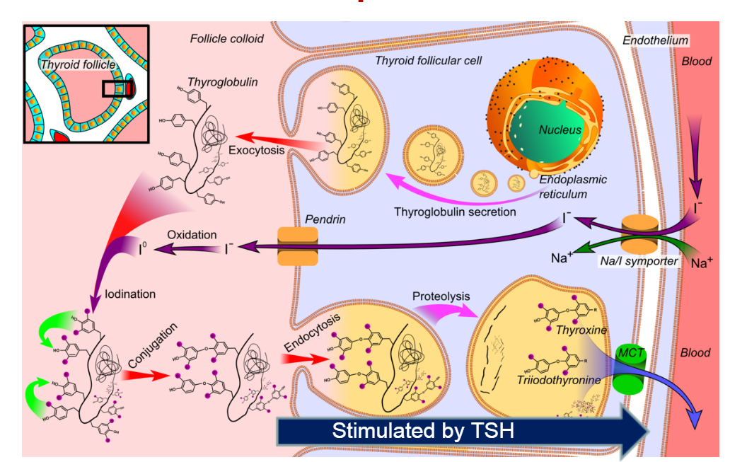 Iodine combined with tyrosine residues by Tyrosine Peroxidase in the Colloid. TSH triggers cleaving and release of THs into plasma
