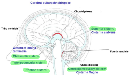 Cerebellomedullary (magna), pontine, superior (ambines), interpeduncular and chiasmatic cisterns. These all drain into the superior sagittal sinus via the arachnoid villi.
