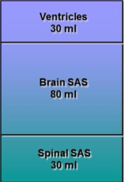 Total volume of CSF ~ 140mL (30 in the ventricles and 110 in SAS & spinal cord). You make about 500mL per day, so you replace it 3-4 per day.