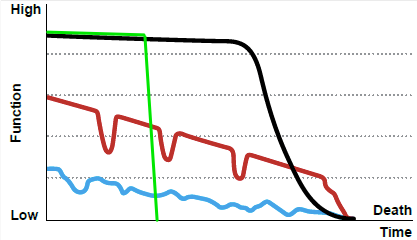 Black = cancer, Red = organ failure, Blue = physical/cognitive frailty. Green = sudden death