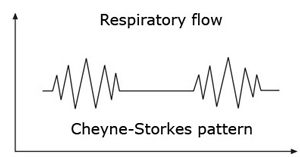 Abdominal breathing, short/shallow breathing, accessory neck muscles and stacked breathing (Cheyne-Stokes). Note that the Cheyne-Stokes breathing looks like gasping, but its just breaths on top of each other and they’re not gasping (agonal breathing).