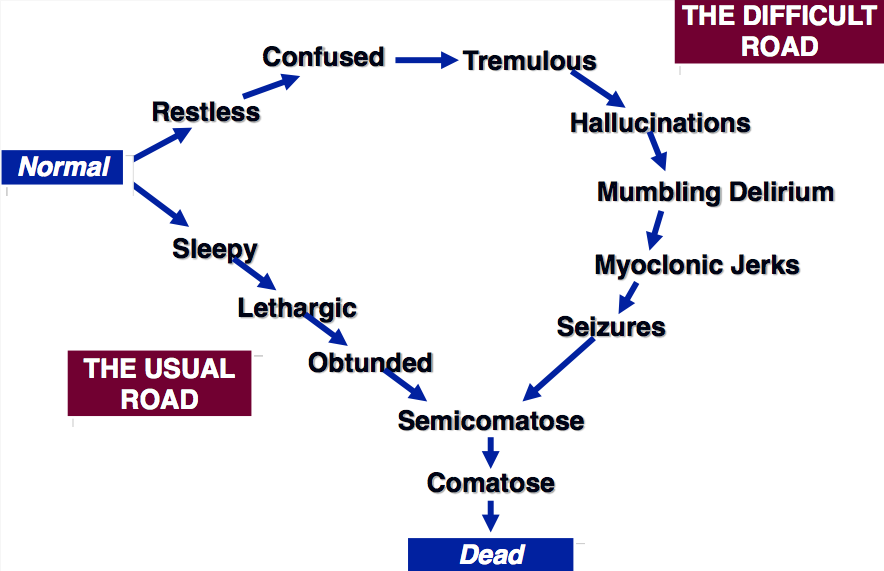 Cognition is minimal, sleep is constant, no muscle control, no nutrient intake (IV not effective) and obtunded