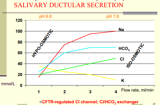 When acid increases (in parietal cells), Na drops and the secretion is hyperosmotic at max flow rate.