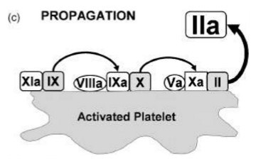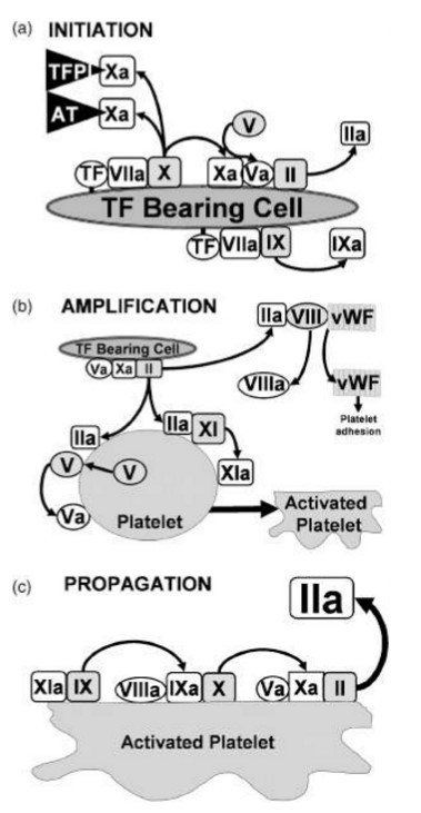 **Coagulation ONLY progresses beyond the small amount of thrombin generated during initation IF the injury allows platelets and other proteins to leave the vascular space and adhere to the TF bearing cells!!**