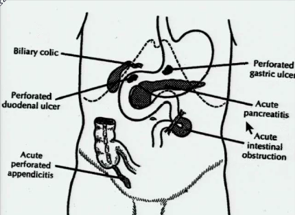 Biliary colic, perforated duodenal ulcer, appendicitis, perforated gastric ulcer, pancreatitis, intestinal obstruction.