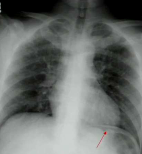 Free air. It typically represents a perforated ulcer or ruptured diverticulum.