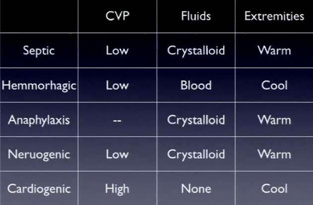 Compare the central venous pressure, fluids and extremities in septic, hemorrhagic, anaphylactic, neurogenic and cardiogenic shock.
