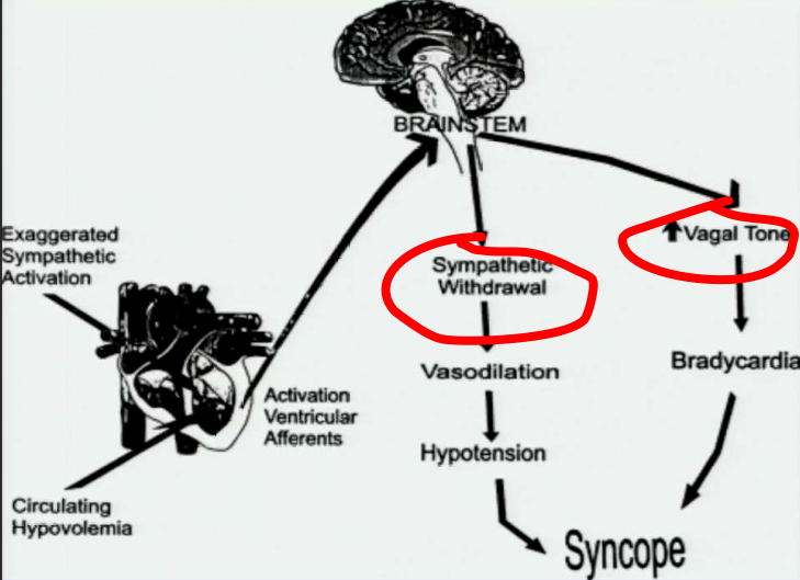 1) Sympathetic activation (pain) 2) Hypovolemia (knees locked). Decrease in venous return + vigorous heart contraction = heart walls slam together causing vagal reflex (contractility decreases, slows heart rate and vasodilation) and a sudden brief decrease in blood pressure.