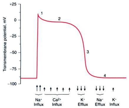Phase 0 is the rapid depolarization, phase 1 is a transient repolarization, phase 2 is the plateau phase where the contraction happens, phase 3 is the repolarization phase and phase 4 is the resting potential phase.