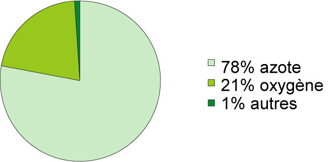 L’air est constituer de 78% de diazote, 21% de dioxygène, 1% d’autre gaz.