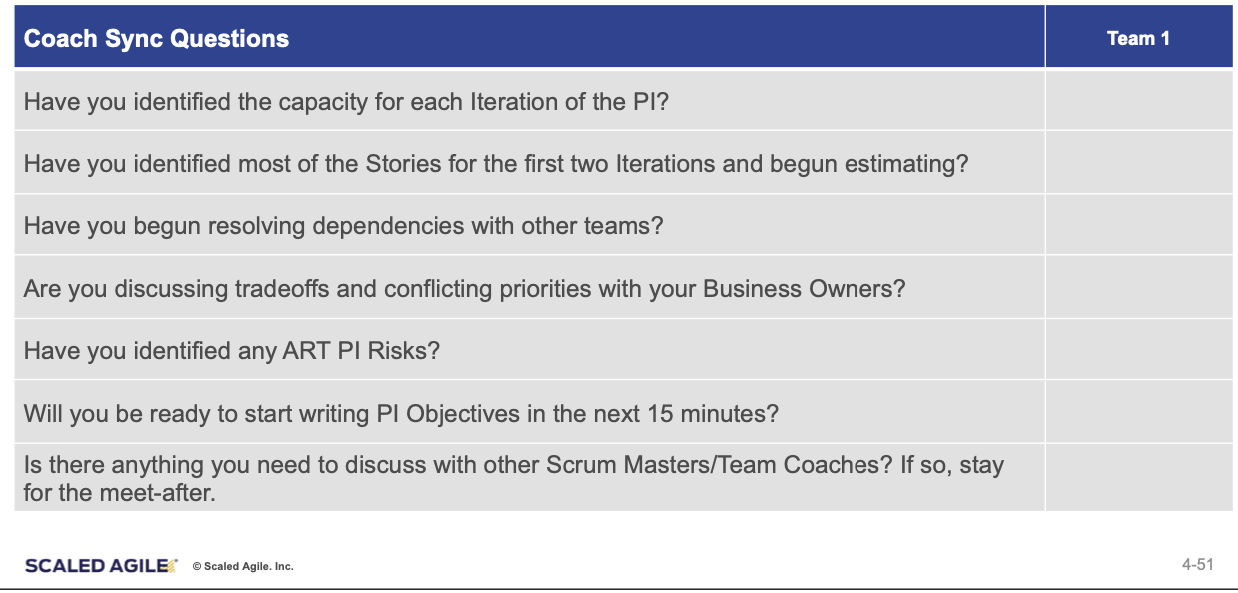 This is when the RTE brings the teams’ ScrumMaster/coaches together to answer the coach sync questions.