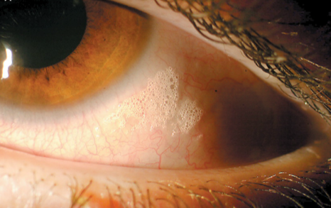 Bitot’s spot is highly suggestive of vitamin A deficiency and, sometimes, chronic conjunctival inflammation. The condition is characterized by metaplasia of the conjunctival epithelium and tangles of keratin admixed with gas-forming bacteria (e.g., Corynebacterium xerosis), giving the lesion its typical foamy appearance