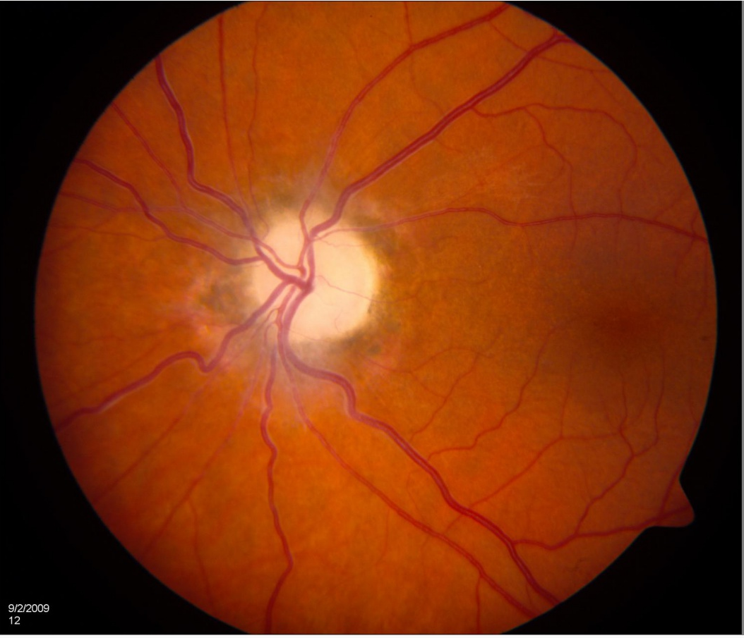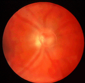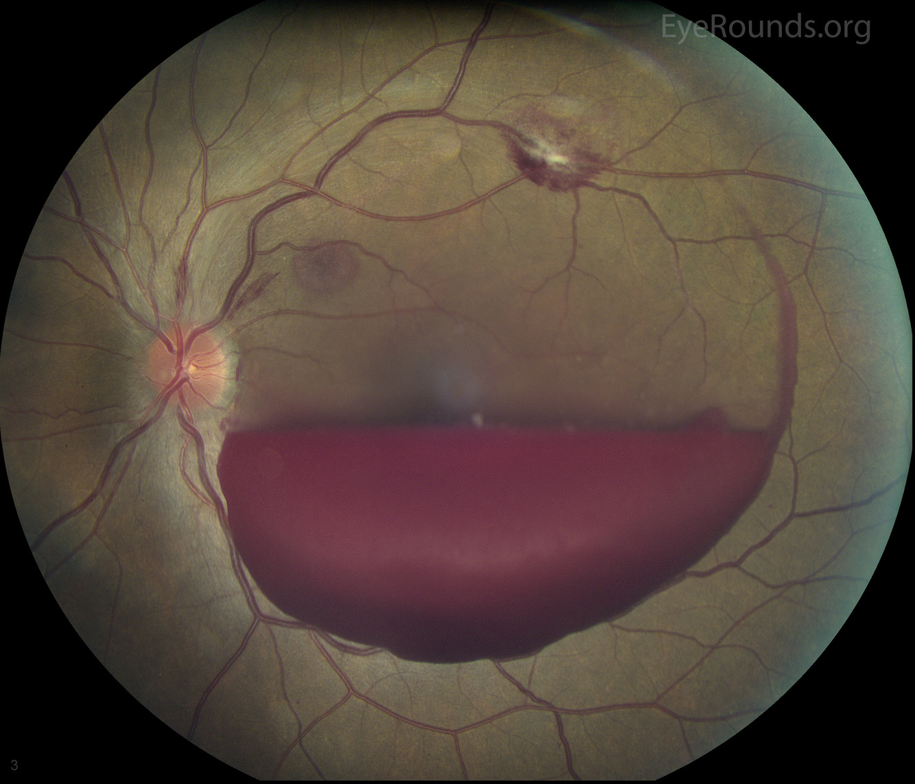 is the presence of vitreous or sub-internal limiting membrane (ILM) hemorrhage after acute intracranial hemorrhage. It has been hypothesized that the bleeding results when a sudden rise in intracranial pressure causes rupture of retinal and peripapillary vessels. This photo shows a patient with a large sub-ILM hemorrhage.