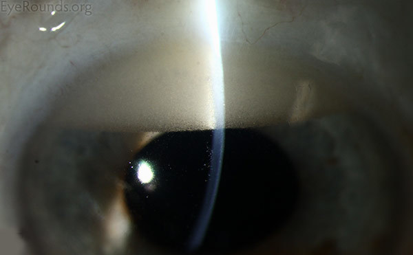 can form when emulsified silicone oil used during vitreoretinal surgery enters the anterior chamber of the eye. The silicone oil floats in the aqueous to look like a layered hypopyon in the upper portion of the anterior chamber.