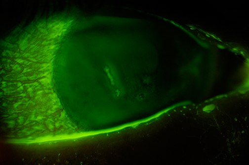 The fine branching elements distinguish this from the linear or geographic pattern of a traumatic corneal abrasion, although the clinical presentations may be quite similar.