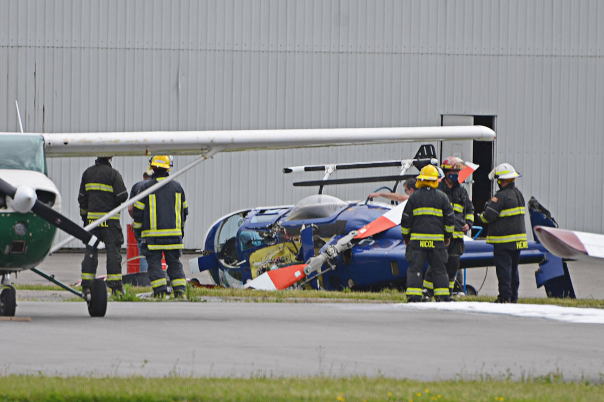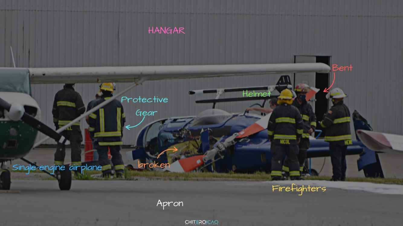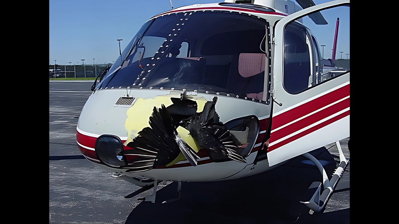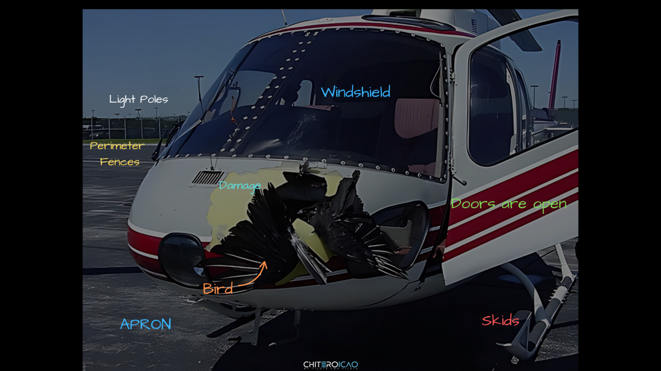 In the center of the image, there’s a medium-sized helicopter parked on the apron. The front part of the fuselage shows visible damage caused by a bird collision.