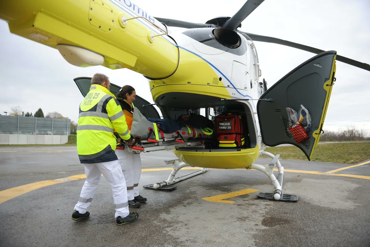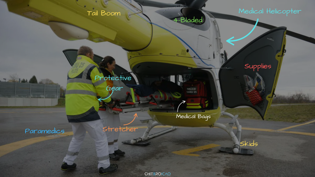 In the foreground, two paramedics are loading a stretcher into the aircraft. The stretcher is attached to a rail system inside the fuselage, which helps slide the patient in safely. And this is a 4-bladed modern helicopter.