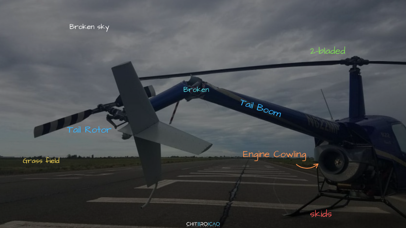 In this picture, I can see a small helicopter with visible damage to the tail section.