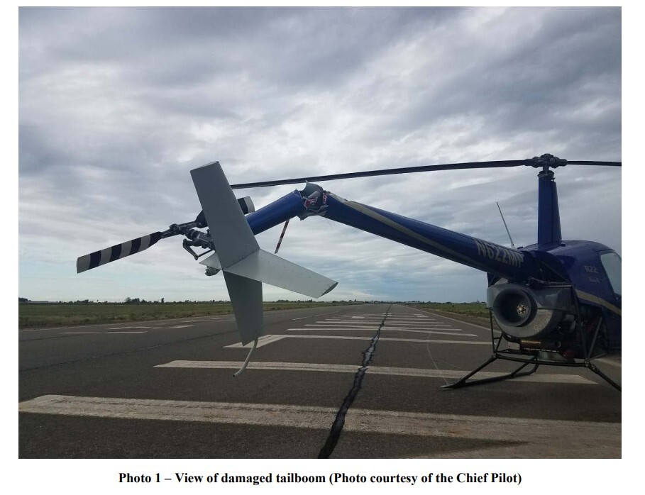 The tailboom appears to be cracked and bent near the base of the tail rotor, which is also tilted out of alignment.