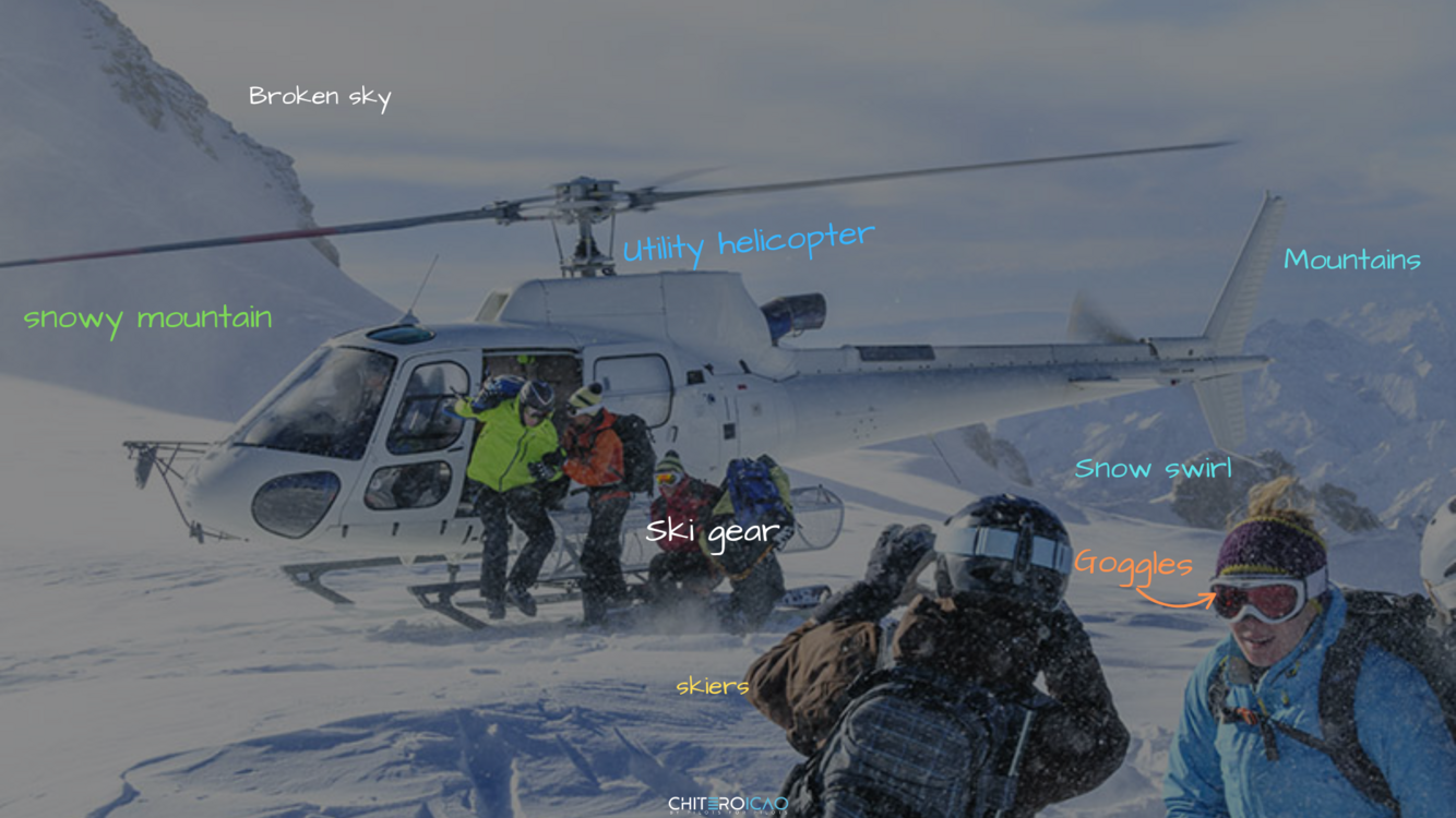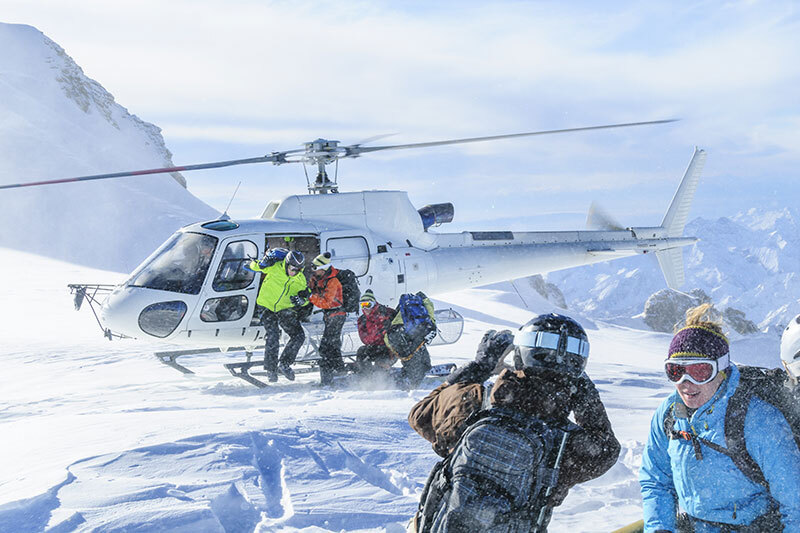 In the center of the image, several skiers are disembarking from the helicopter, while others are already on the ground preparing their gear.