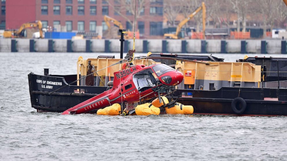 In the center of the image, the helicopter is partially submerged and is being lifted by a crane mounted on a rescue boat.