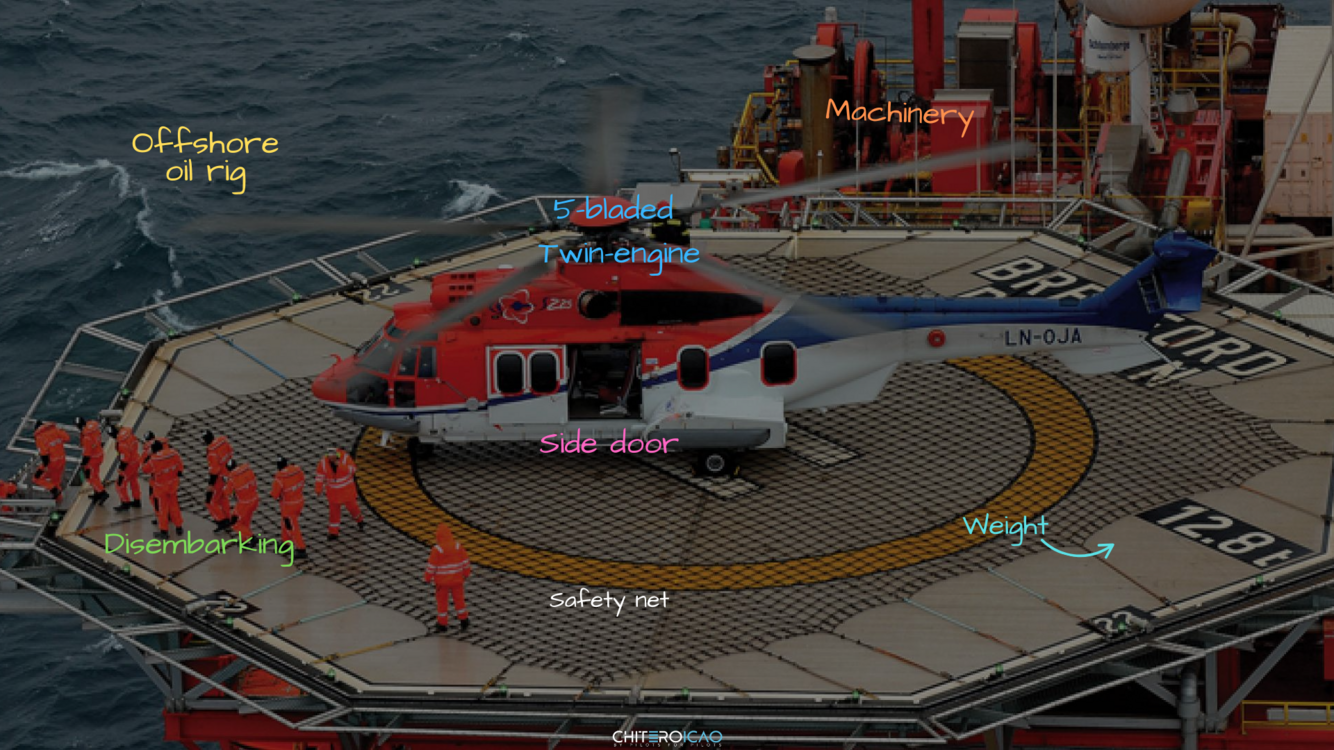 The helideck is clearly marked with a yellow circle and has a visible weight limit of 12.8 tonnes. It’s equipped with safety nets around the perimeter and lighting for visual guidance.