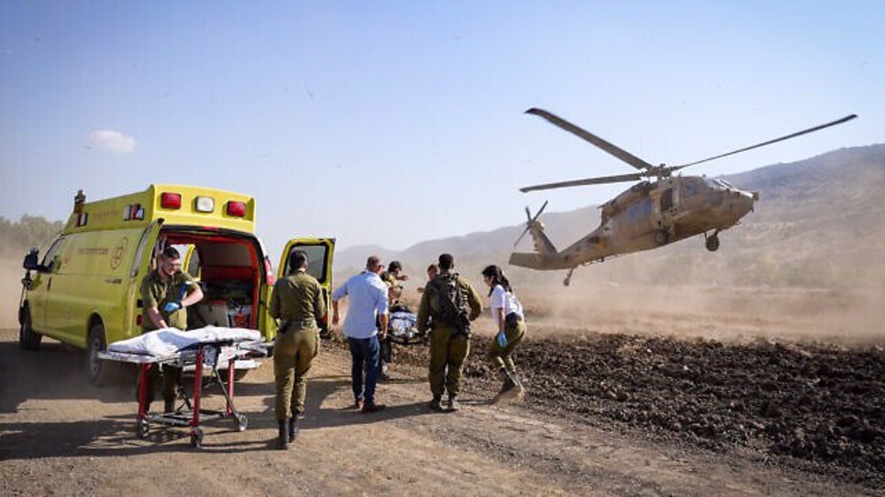 On the left side of the image, there is a yellow ambulance with its rear doors open and a stretcher being prepared by medical personnel. Several soldiers and medics are assisting in transporting a patient toward the ambulance.