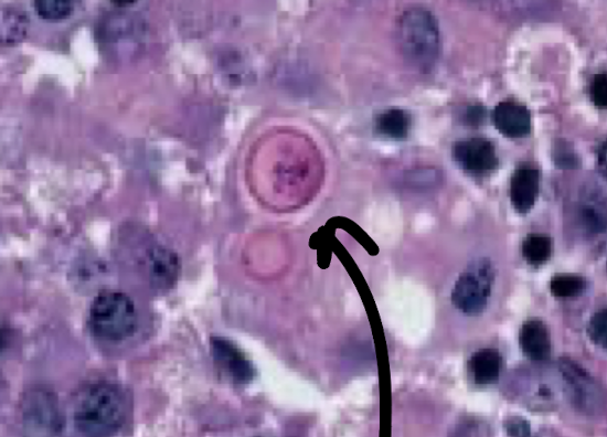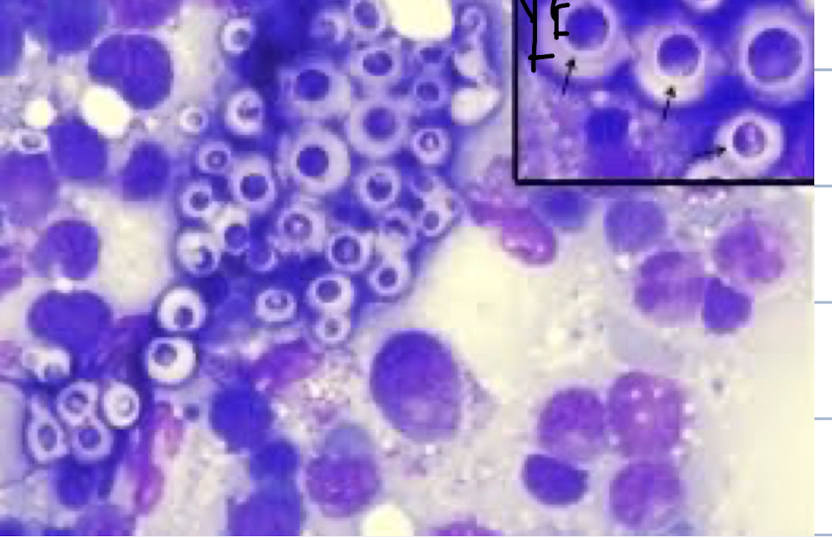 Cryptococcus, it is similar in appearance to blastomyces although the latter has a thinner wall and may be seen to be budding.