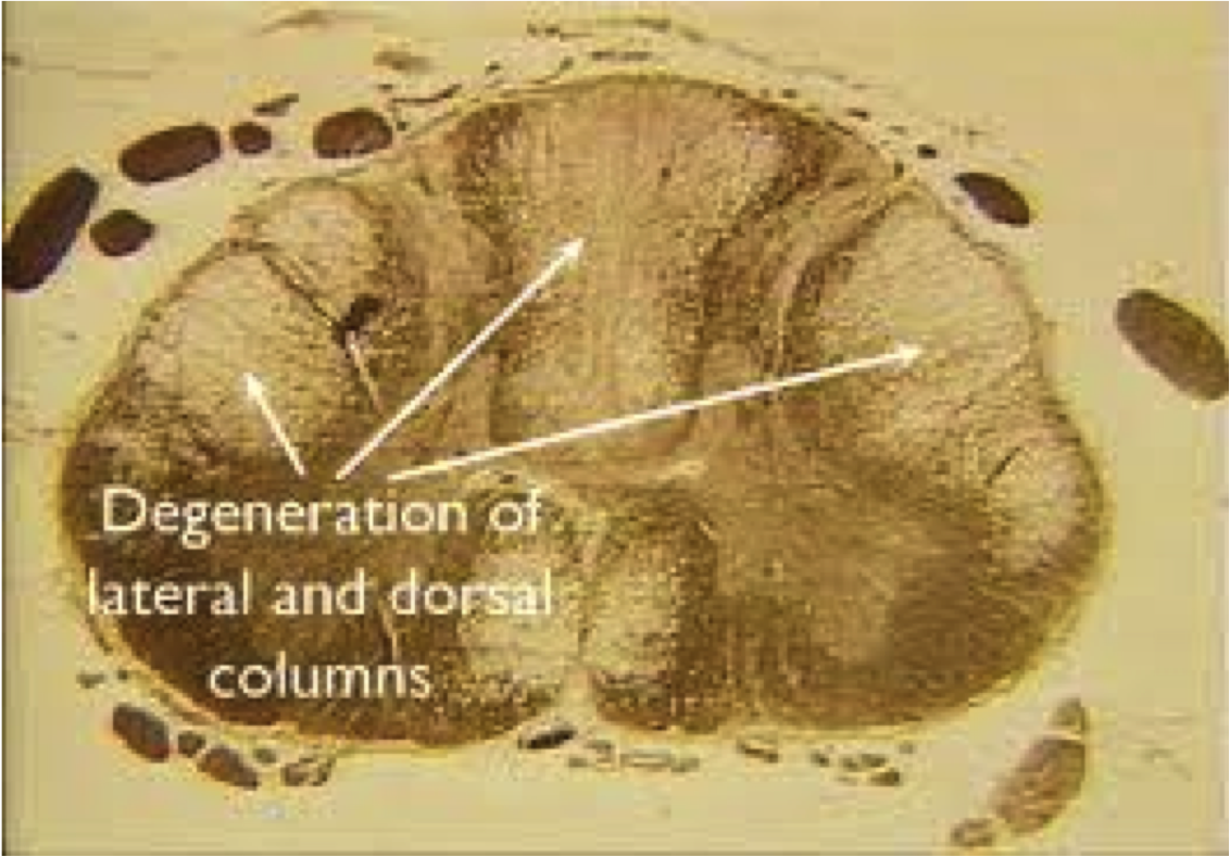 demyelination of lateral & dorsal columns due to vit b12 deficiency. Will cause loss of vibration & pressure.