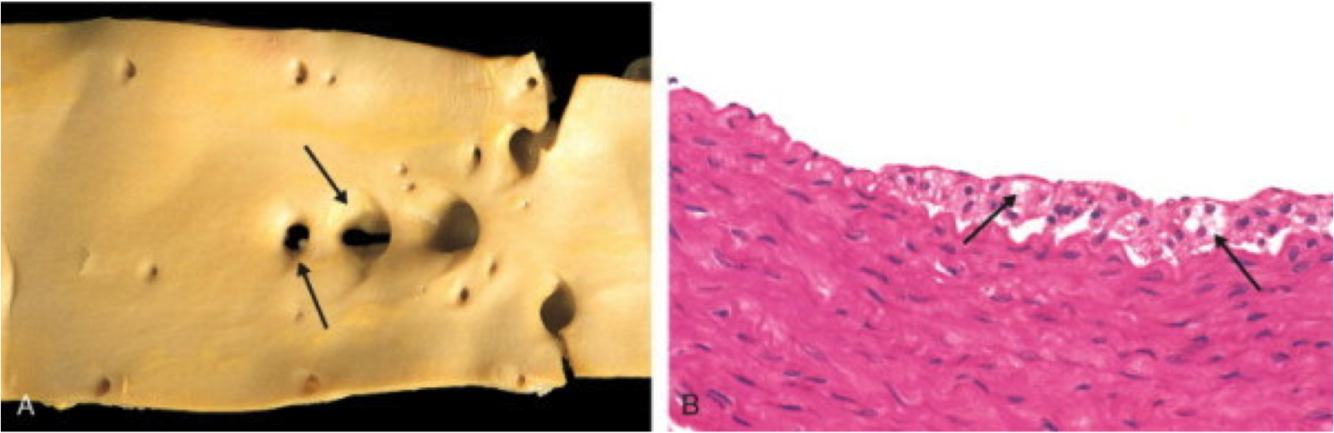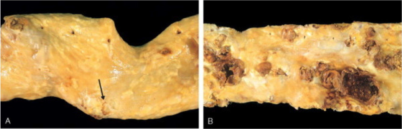 A & B: fatty streaks & atheromas make these aortas crunchy like butterfingers