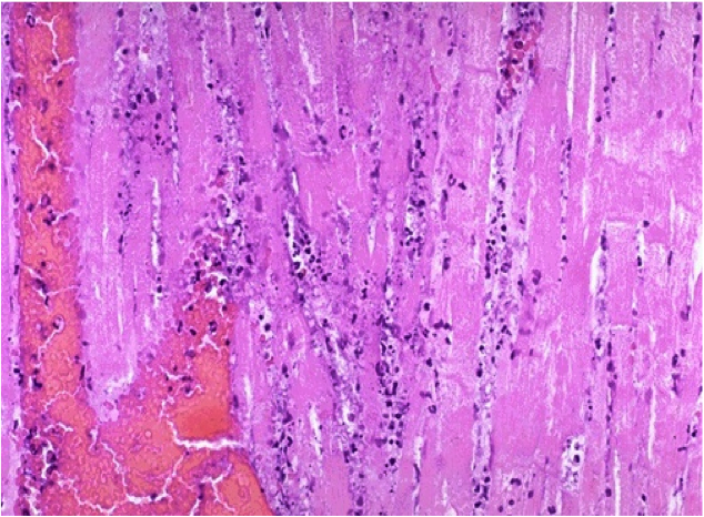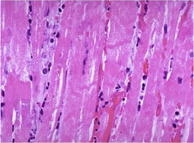 macrophages are eating up the dead tissue (myocytes)