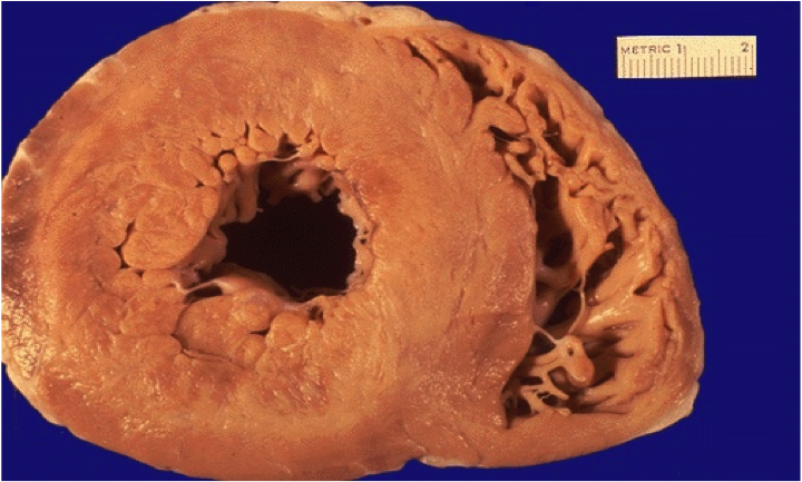ventricles have the same chamber size, but much greater ventricular wall thickness.